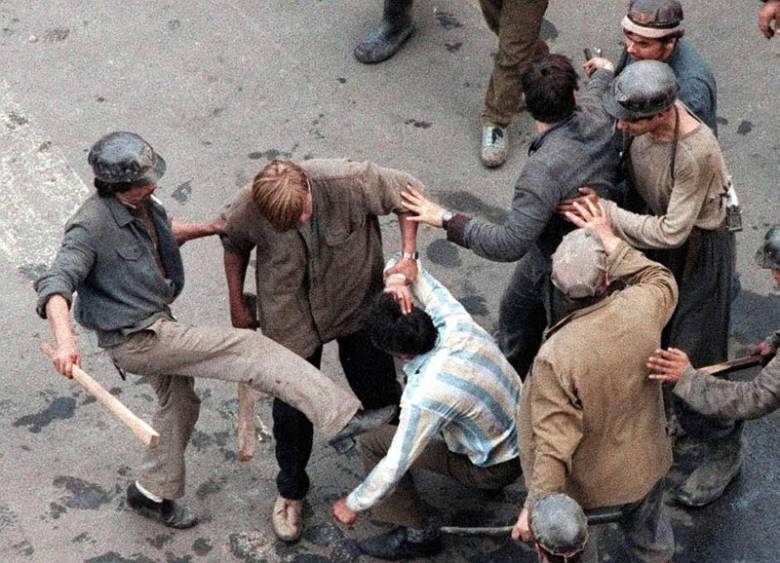 • Június 14-én hajnalban 10 ezer bányász érkezik a Zsil völgyéből Bukarestbe, botokkal, láncokkal felfegyverkezve. A Victoria-palota előtt Ion Iliescu arra kéri őket, „foglalják el, és tisztítsák meg az Egyetem teret. A bányászok szétverik a fővárost, az ellenzéki pártok és lapok székházait – a România Liberă négy napon keresztül nem tud megjelenni a standokon –, egyszerű járókelők százait verik meg brutálisan, de a rendőrség nem avatkozik közbe.