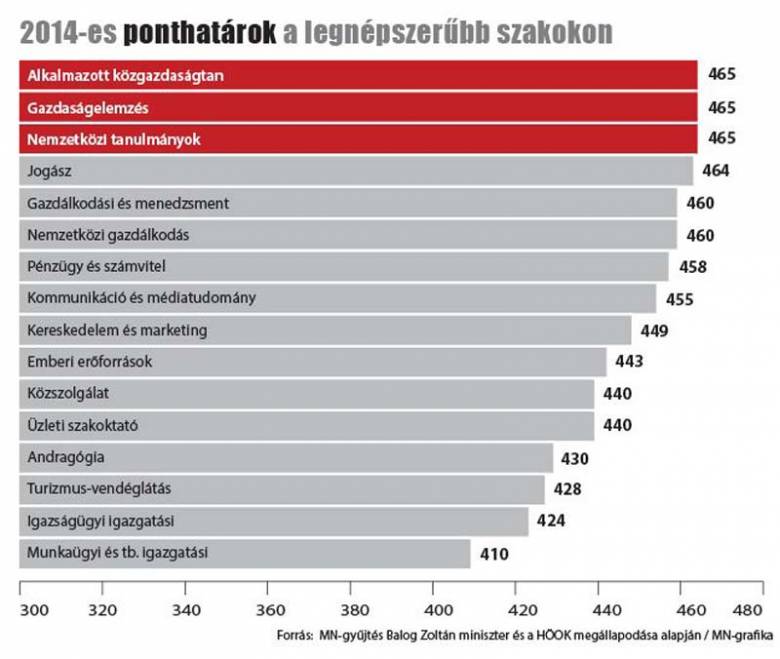 A ponthatárokat idén is július 24-én hirdeti majd ki az Oktatási Hivatal, ez alól kivételt képez a 16 legnépszerűbb szak, amelyeknek ösztöndíjas pontszámait különmegállapodásban már előzetesen rögzítették. Ez garantálja, hogy mindegyik szakon lehet állami támogatással tanulni, de a legkedveltebbeken, így a gazdasági képzések többségén, igencsak jól kell teljesíteni az ösztöndíjas helyekért: alkalmazott közgazdaságtan, nemzetközi tanulmányok vagy gazdaságelemzés szakon például 465 pontot kell elérni a maximális 500-ból, a jogászképzésen 464-et, a kommunikáción pedig 455-öt. Jó hír ugyanakkor a felvételizőknek, hogy mivel a kormány ígéretet tett arra, hogy az első helyes jelentkezők 10 százaléka biztosan állami ösztöndíjjal tanulhat ezeken a szakokon, kilátásba helyezték: ha nem lesznek elegen, akik teljesíteni tudják a szintet, néhány ponttal esetleg csökkenhet az előzetesen megszabott határ.