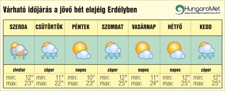 A HungaroMet Magyar Meteorológiai Szolgáltató Nonprofit Zrt. által az Erdélyi Napló számára készített egyhetes időjárás-előrejelzés szerint a jövő hét elején több lesz ugyan a napsütés, de a tartós esőfronttól nem szabadulunk.