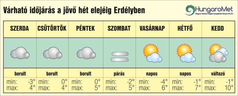 A HungaroMet Magyar Meteorológiai Szolgáltató Nonprofit Zrt. által az Erdélyi Napló számára készített egyhetes időjárás-előrejelzés szerint jövő hét elején is kitartanak az erős éjszakai fagyok, nappalra viszont megenyhül az idő, és fagypont fölötti hőmérsékletre számíthatunk.