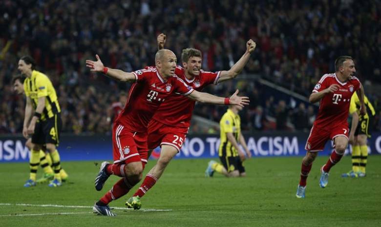A favoritnak tartott bajor csapat gyengébben kezdett a fináléban, beszorult saját térfelére, a dortmundiak pedig sorra alakították ki helyzeteiket, ám Lewandowski és társai elpuskázták a lehetőségeket. A félidő végére kiegyenlítetté vált a játék, a Bayern előtt is akadtak lehetőségek. A negatív főszereplő Arjen Robben volt, aki két-három ziccert is kihagyott. Már-már felsejlett a holland világbajnoki döntőben nyújtott gyenge formája, a 2007-es BL-elődöntőben elrontott tizenegyese, de főleg a tavalyi év, amikor Robben a BL-döntőben és a német bajnokságért – éppen a Dormund ellen – vívott párharcban is büntetőt hibázott. Ám a démonból angyallá változott Robben – akinek a játéka a második félidőre igencsak robbanékonnyá vált – a bajorok első találatát megelőző gólpassza után a lefújás előtt egy perccel a győztes gólt is megszerezte.